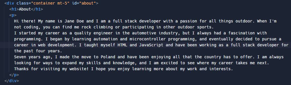 For a website’s “about” page, write an essay about me. I enjoy programming, outdoor sports, and rock climbing. Although I began my career in the automotive sector as a quality engineer, I have always been interested in programming. I began by automating and programming microcontrollers. I’ve lived in Poland for seven years. I began working on websites on my own four years ago using HTML and JavaScript. As a Full Stack Developer, I am currently employed.